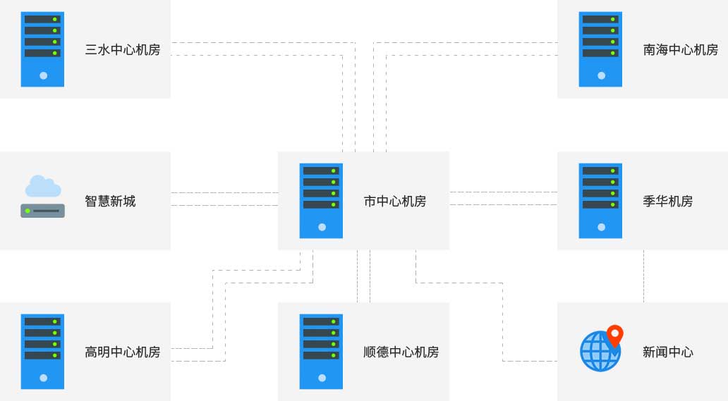 佛山廣電網絡主干光纜路由如下圖所示,此次光纜監測主機安裝在市中心機房,同時在下屬的7個分公司機房安裝光源設備,實現對佛山廣電主干光纜的實時監測。